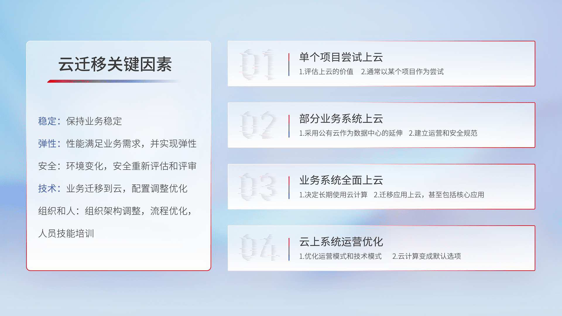 结合实际业务,,从规划设计、、云平台选型、、、云原生改造、、、、数据迁移、、、、集成交付,,,,迁移全过程为客户识别最佳上云路径,,,做好风险识别管理,,,设计网络架构、、、身份权限、、安全审计合规、、、操作审计、、、、日志审计、、、、监控告警策略、、多站点容灾设计等,,对云上基础设施进行整体规划,,提升IT治理水平,,,,以满足弹性、、、高可用、、、高性能的需求。。。