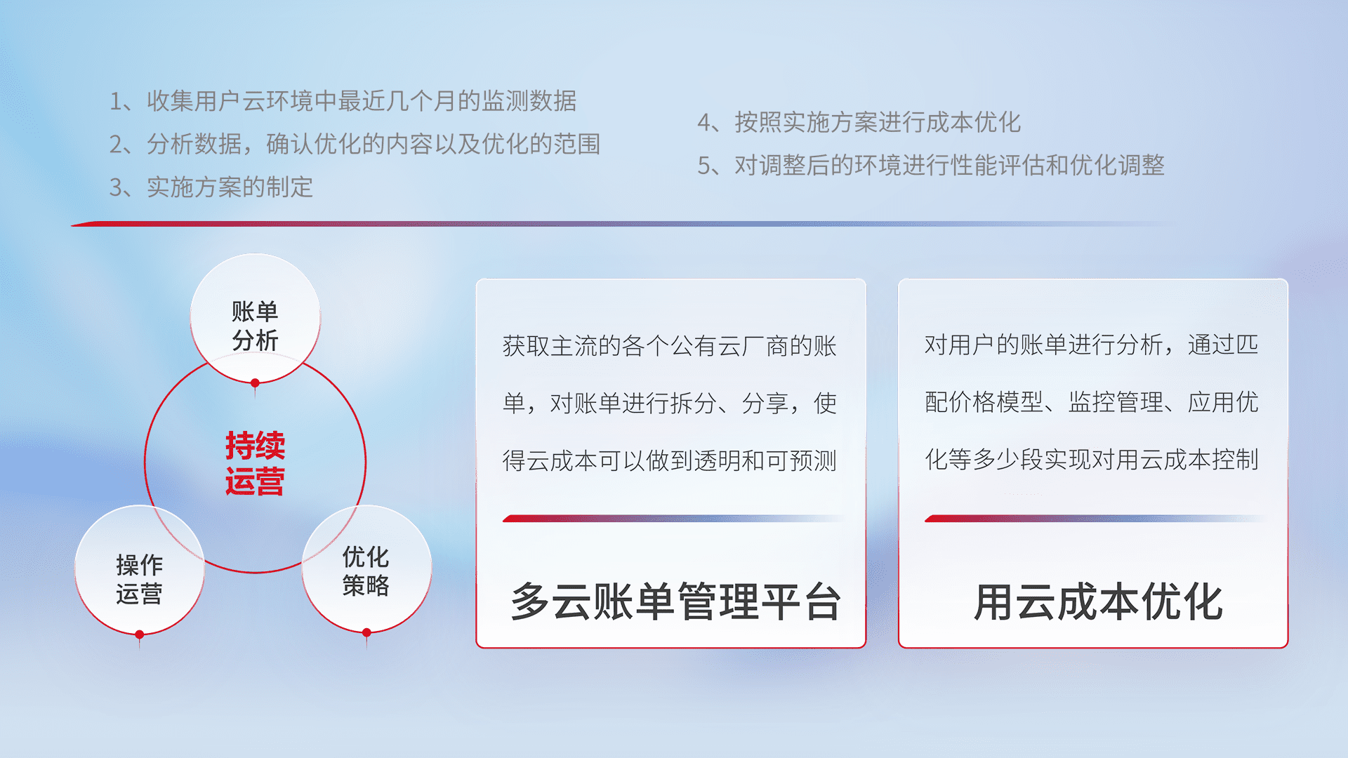 通过多云纳管,,以统一的资源数据模型把客户的云资源进行抽象和封装,,,,进而实现对多云资源的统一操作,,保障云资源管理的可靠性、、、稳定性与可用性。。。量身定制化运维内容,,,配置、、、开发运维、、、补丁管理、、、、备份、、、、监控、、认证和访问管理、、审计和日常巡检等,,,保障在用云过程中的可靠度,,稳定度以及高可用率。。。。